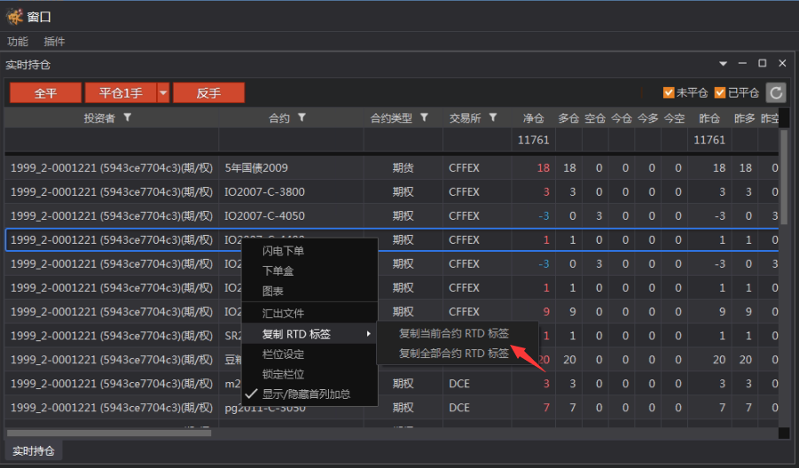 在咏春大师2的实时持仓功能中,使用右键菜单“复制RTD标签”选择“复制当前合约RTD标签”或者“复制全部合约RTD标签”。