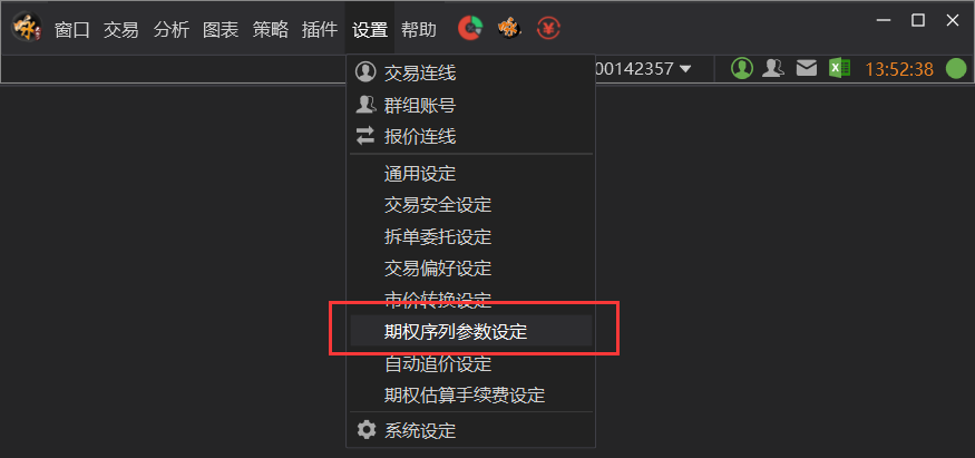 行情API可订阅本地实时运算高频Greeks报价,并可在“设定->期权序列参数设定”自定义运算参数。
